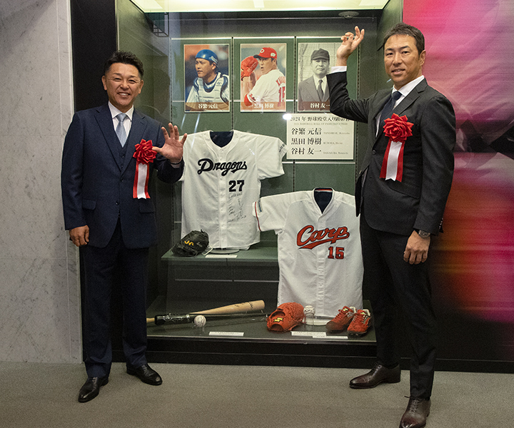 2024年の野球殿堂入り通知式が1月18日、都内の野球殿堂博物館で行われた。プレーヤー表彰では大洋・横浜(現DeNA)、中日でプロ野球史上最多の3021試合出場を果たした谷繁元信氏、広島、ドジャース、ヤンキースで日米通算203勝を挙げた黒田博樹氏が選出。特別表彰では元セ・リーグ審判員の谷村友一氏(享年94)が選ばれた。 写真=高原由佳、BBM