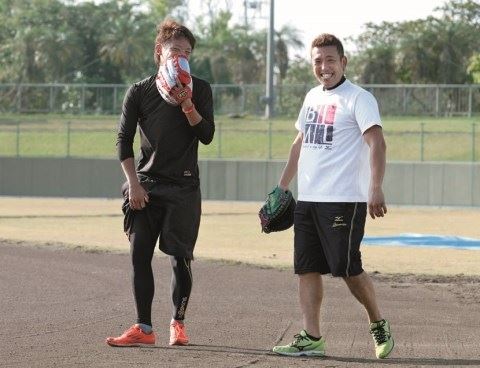 1月は東浜[写真左]、巽らとともに沖縄で自主トレを行った。表情の明るさが状態の良さを物語る[写真=黒田史夫]