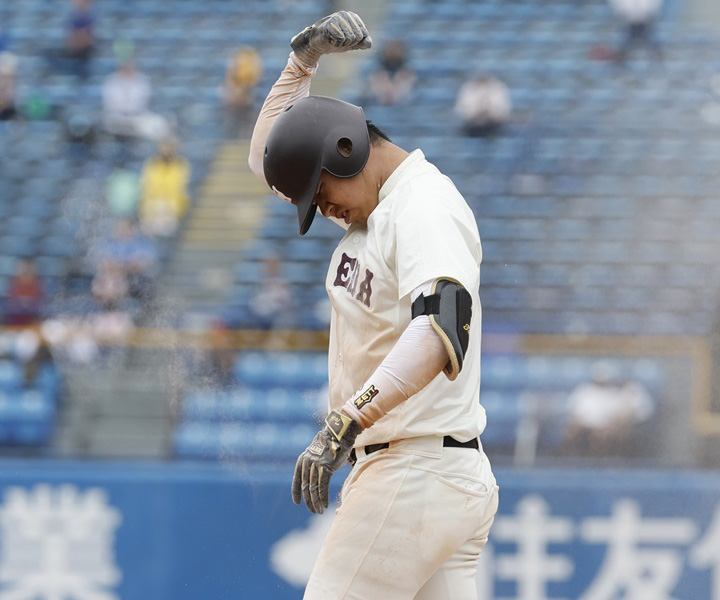 主将・印出は1回表に右前へ先制適時打、8回表には遊撃内野安打が貴重なタイムリー[写真]に。一塁ヘッドスライディングの気迫を見せた[写真=田中慎一郎]
