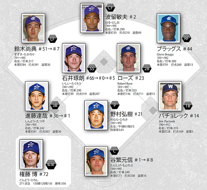 【90年代成績】650勝665敗6分勝率.494(リーグ5位) 5人の監督が指揮を執った1990年代。前半低迷するもチーム力は徐々に底上げされ、38年ぶり日本一へと実を結ぶ。
