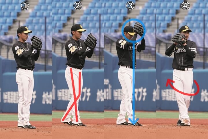 バッターに正対し(写真1)、左足を大きくプレートの後方に引いて両足をクロスさせるスタート(写真2)は賛成しかねますが、写真3で足元に視線を落とすことで頭(つまり重心)が左足に引っ張られて後方にズレることを防いでいるのは良いと思います。とはいえ、写真3〜写真5までの間に左足を回し上げなければならず(軸足に巻き付けて最小限にとどめてはいるようですが)、真っすぐに立つ写真5で、最も重要なバランスを保つこと、そして高く足を上げることを考えると、ムダな動きと私は考えています。また、回し上げることで、タイミングが合わない、左肩が入り過ぎてしまうなど、上半身がブレる要素を生んでしまうことにつながる心配もあります。