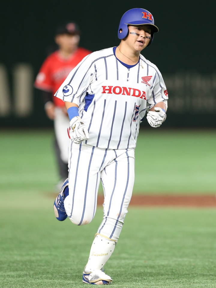 Honda熊本・古寺は東邦ガスとの準々決勝で右越えのソロ[写真]。セガサミーとの準決勝でもサヨナラ弾を放っている[写真=佐藤博之]