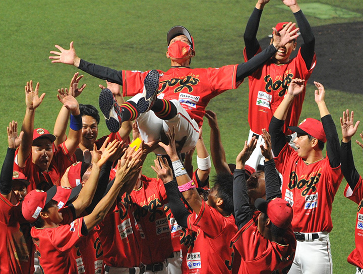 後期優勝を決めて選手たちから胴上げされる高知・吉田監督