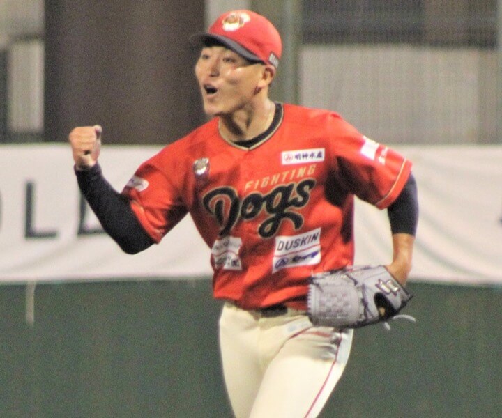 6月3日の愛媛戦、9回二死満塁のピンチを切り抜けガッツポーズを見せる高知・秋田