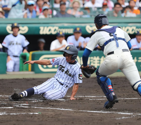 準決勝の初回、花咲徳栄高バッテリーのスキを突いて、ホームを陥れた東海大菅生・田中/写真=太田裕史