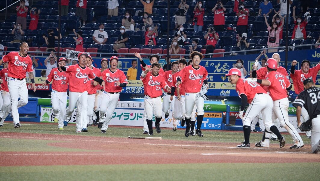 8月20日のソフトバンク戦[ZOZOマリン]、10回二死から2点差をひっくり返したロッテ/写真=内田孝治