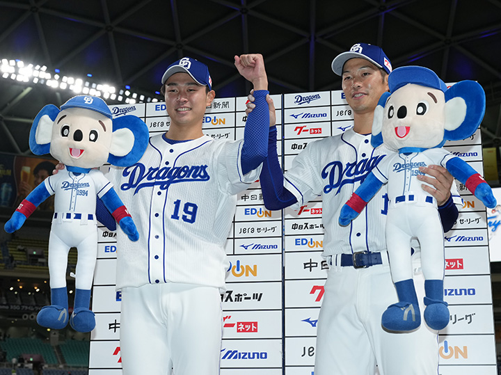 4月20日のヤクルト戦、本拠地・バンテリンドームで初勝利を挙げた高橋宏斗は京田陽太[右]とともにお立ち台に上がった[写真=川口洋邦]
