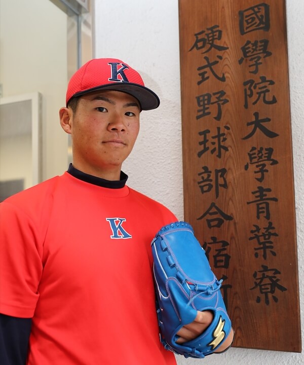 神奈川県横浜市内にある国学院大学野球部合宿所玄関前にて撮影。4年生として、チームをけん引する自覚が宿っている
