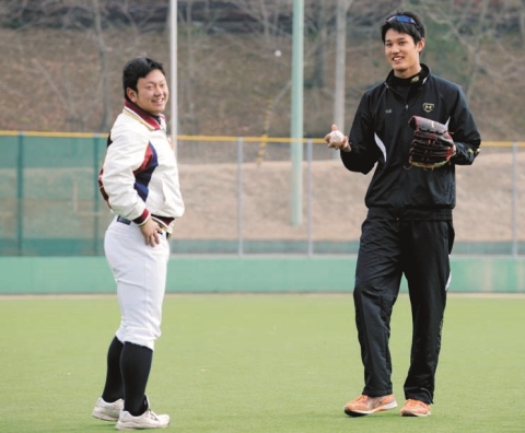 ▲グラウンドでは14年西武ドラフト1位の森友哉と談笑。12 年甲子園春夏連覇のバッテリーは交流戦での対戦を誓った 2 オフにしっかりと体を作り上げ2年目に突入した藤浪。自分の原点である母校・大阪桐蔭高のグラウンドで始動した