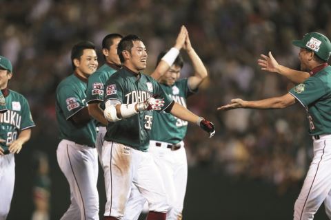 ▲昨年の8月25日のロッテ戦(Kスタ宮城)でのサヨナラ安打を放ったシーン。ニューヒーロー誕生の予感を感じさせる一打だった
