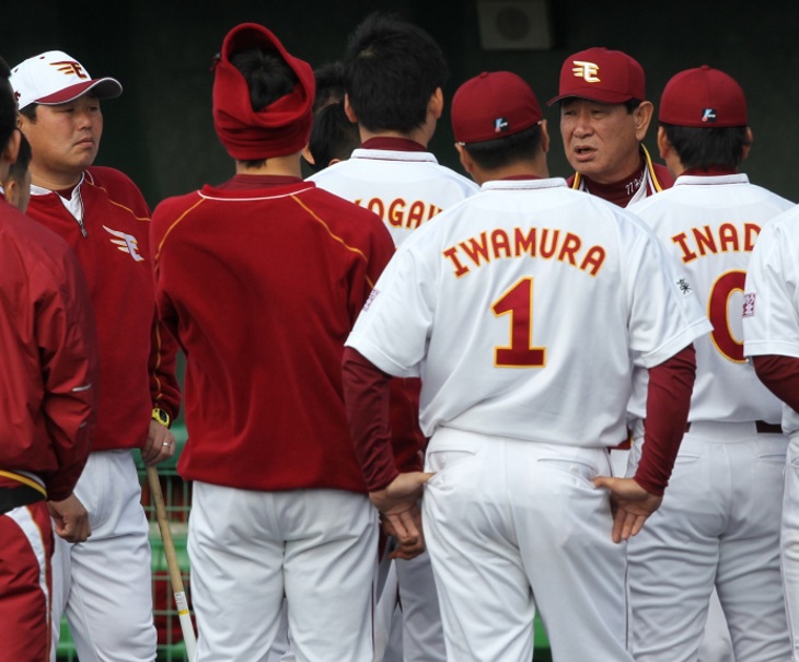 野球界に迷惑をかけた男なのに、半ば強引に? 楽天の打撃コーチとして迎え入れてくれた星野監督[写真右から2人目]。ただただ感謝しかないです/写真=BBM
