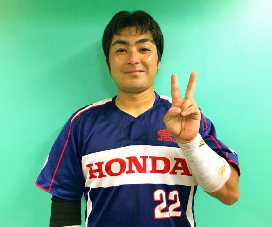 16日の第1試合で先制タイムリー二塁打を放ち、チームの勝利に貢献したホンダ熊本のベテラン捕手・浜岡直人選手(九州学院高-亜細亜大)。「マイホーム買っちゃいました!」と満面の笑みで幸せ話をしてくださいました。