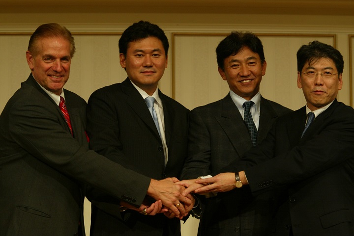 11月2日に参入が認められた楽天。写真右から2人目が田尾監督、左隣が三木谷オーナー