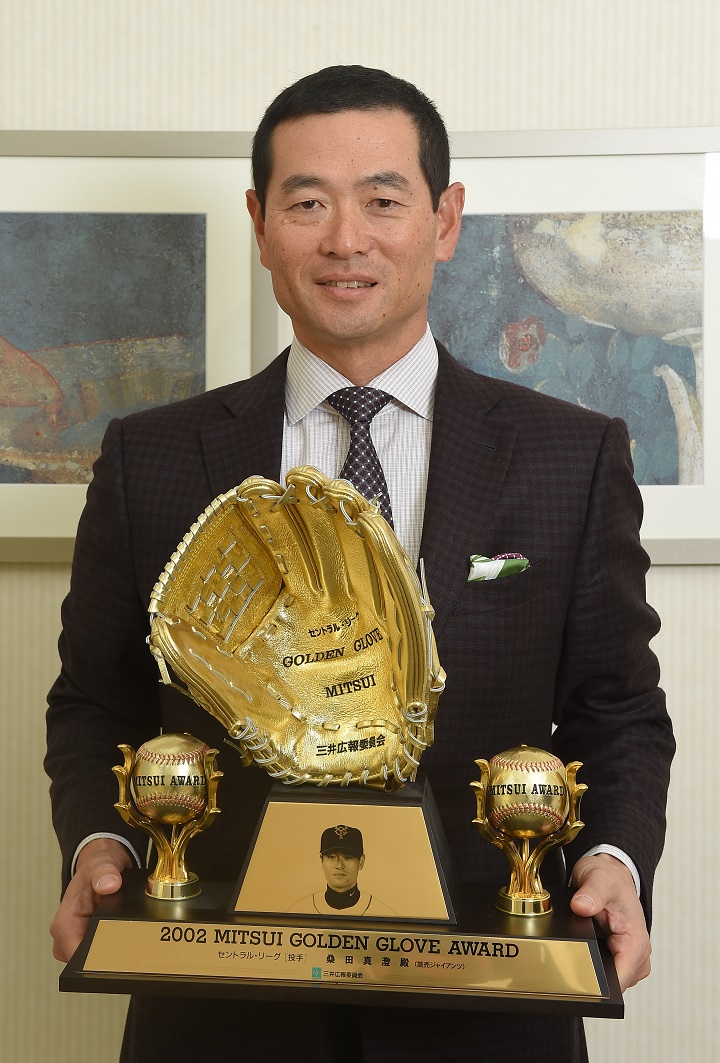 GG賞の金色のグラブのトロフィーを手にする桑田
