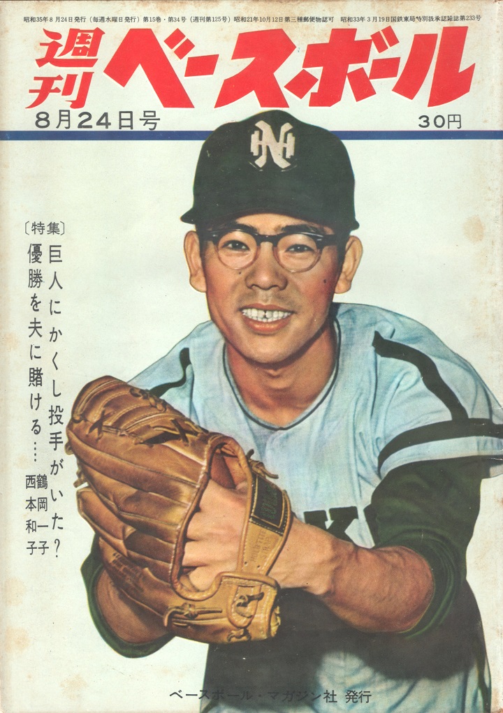 今回は『1960年8月24日号』。定価は30円だ。巻頭グラビアは『板東“完全試合”を逸す』。8月2日、熱帯夜の