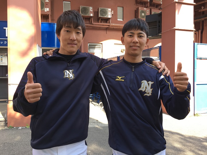 日本新薬・大崎拓也内野手(左)、長谷篤投手