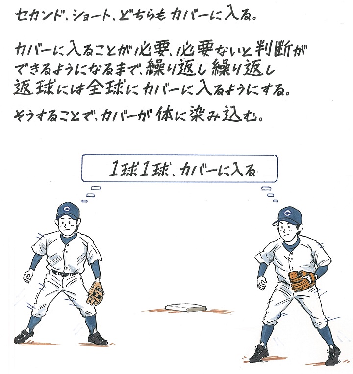 本来、ランナーがいないときにはカバーに行く必要はないのですが、ではいざランナーが出たときに頭をパッと切り替えられるかといえば、小学生はそうではない年齢だと思います。私も子どもたちの指導をする機会が増えているのですが、試合などを見ていると、カバーを忘れてしまってボーっと立っている選手を見かけることがあります。自分でこのケースはカバーが必要、必要ないと判断ができるようになるまでは、繰り返し繰り返しカバーに入るように、とにかく返球には全部カバーに入るように指導することが必要だと思います。本来はセカンド、ショートの両方で行く必要もないのですが、2人でカバーに行かせるのもそのためです。
