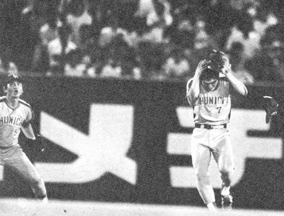 宇野勝です! 84年にはホームラン王にもなっている大型ショートですが、このヘディング事件は、フジテレビの「珍プレー好プレー特集」で有名になり、結果的には、球史に残るプレーになってしまいました。テレビは、ほんと怖いですね。
