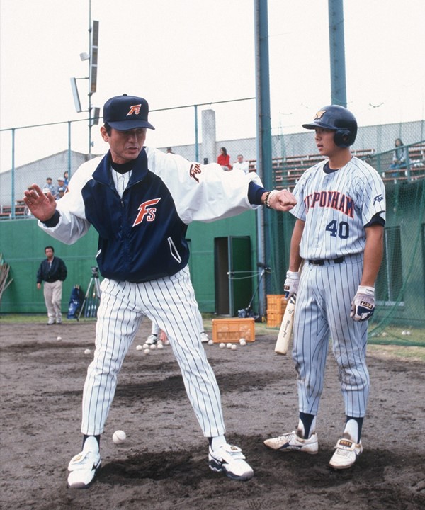 監督1年目の秋季キャンプで實松一成[右]に打撃指導する僕