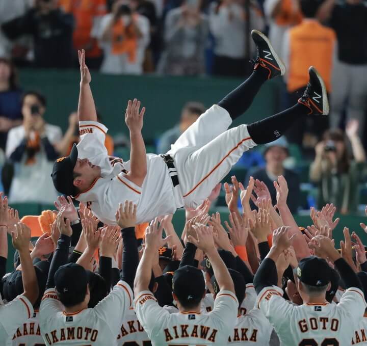 日本シリーズ最終戦の後、胴上げされる巨人・阿部。幸せな引退だと思います