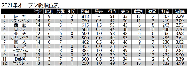阪神が1位となった今年のオープン戦だが、2位の