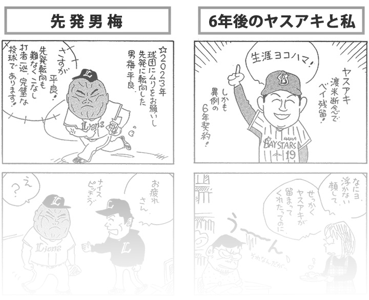 やく「6年といわず、期間内に優勝してくれんと、命がもたん……」 担当「同じ思いのファンも多いだろうし、『命がもたん』と書かれたタオルを販売すればヒットするかも」 PROFILE やくみつる●1959年3月12日生まれ。代表作に「パロ野球ニュース」「やくみつるのガタガタ言うゾ!」「やくみつるのマナ板紳士録」「やくみつるの平成ポテンショット」など多数。本誌連載のほかにも、コメンテーターとしても幅広く活躍中。