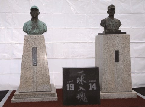 ▲球場の全面改修にともない、両氏の偉業と功績をたたえるために公園内の別々の場所に設置されていた胸像も、一塁側のスタンド裏に移設。この日、除幕式が行われ、親族を代表して沢村氏の長女・酒井美緒さんと西村氏の長女・津野田ジョイス幸子さんが出席した。