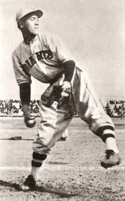 西村幸生 にしむら・ゆきお●1910年11月10日生まれ。三重県出身。宇治山田中から愛知電鉄、関大を経て37年に26歳でタイガース(現阪神)へ入団。制球力に富んだ投手で、初年度から15勝を挙げてチームの優勝に貢献した。肩の故障もあり、39年までのわずか3年間で退団(その後、40年は満州の実業団・新京電電でプレー)しているが、通算55勝21敗を記録している。45年に34歳で戦死。77年に野球殿堂入り(特別表彰)している。 沢村栄治 さわむら・えいじ●1917年2月1日生まれ。三重県出身。34年に京都商を中退し日米野球のため全日本入り。11月20日の草薙球場での一戦では、快速球とドロップでベーブ・ルースらを擁する全米打線を8回1失点9奪三振。のち大日本東京野球倶楽部、巨人。プロ野球最多タイ記録の3度のノーヒッターを記録するなど、通算63勝22敗。太平洋戦争中の44年、27歳の若さで戦死。59年に野球殿堂入り。最初の5人のうちの1人に選ばれた。