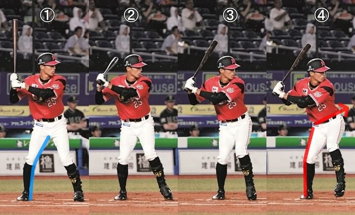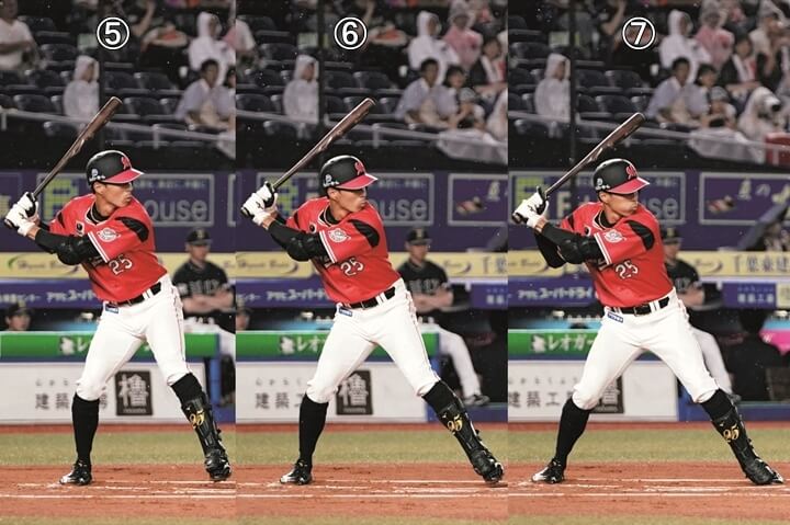 打撃フォームから見ても分かるとおり、待とう、後ろで打とうという意識が強過ぎるように感じます。その影響で、写真(1)から写真(3)でテークバックをとっていく過程もそうですし、写真(4)から踏み出していく過程においても、左の腰が上を向いてしまいます。待ち過ぎる、そして腰が上を向くことで生まれる弊害は、人それぞれで、かつさまざまですが、岡選手の場合はまず軸足にためているはずの力が、いわゆる軸足外側体重になることで後ろ側(キャッチャー方向)に逃げてしまっています。特に写真(4)以降で踏み出していくシーンで顕著で、これでは何のためにパワーをためてきたのか分かりませんし、ここで力をロスすることで実際の打球の強さや飛距離にも大きな影響があるでしょう。写真(1)〜写真(3)にかけての体を絞る意識は良いのですが、腰が上を向くので、それを支える軸足(右足)が耐え切れなかったのでしょう。そもそも、このとき・・・