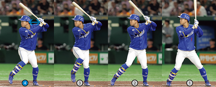 自然体で構えた[1]ではバットを立てていますが、[2][3]と右足をスッと引いていきながら、バットが振り出しやすい角度へと寝ていきます。[4][5][6]と右足をステップしていく過程で、体が前へ体重移動していくにつれてグリップと顔が離れていき、グリップとボールとの距離をしっかりとることができています。