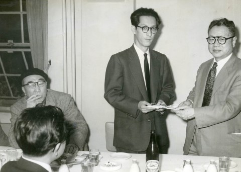 プロ野球を題材にした58年発表の『四万人の目撃者』で探偵作家クラブ賞。と書いてきて資料室をのぞいてみたらすごい写真が出てきた。昭和30年代半ばの推理小説界の重鎮たちだ。左から江戸川乱歩、有馬、木々高太郎(林髞)。有馬の受賞風景らしいのだが、確定できないのが残念!!