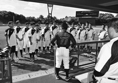 侍ジャパン大学代表を率い3年目の善波監督[背番号77]がメンバーを前にして円陣を組む。日の丸のプライドを持って戦う[写真=黒崎雅久]