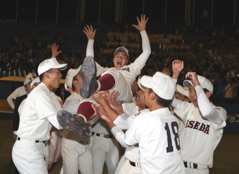 早実は日大三高との決勝で、同点の9回表に2点を勝ち越されたが、その裏、適時打と暴投で追いつき、最後は四番・野村のサヨナラ2ラン。試合後に主将・清宮は胴上げされる/写真=川口洋邦