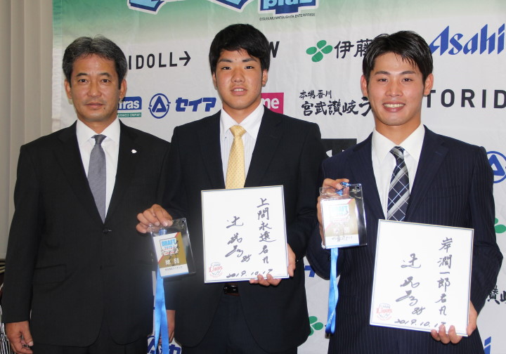 写真左より西武・潮崎編成グループディレクター、上間[7巡目指名]、岸[8巡目指名]