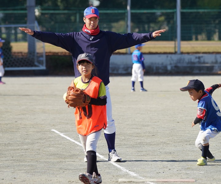 地元の「ティーボール大会」で審判員を務めた埼玉武蔵・松岡。地元・西武で小学生のあこがれとなる投手を目指す
