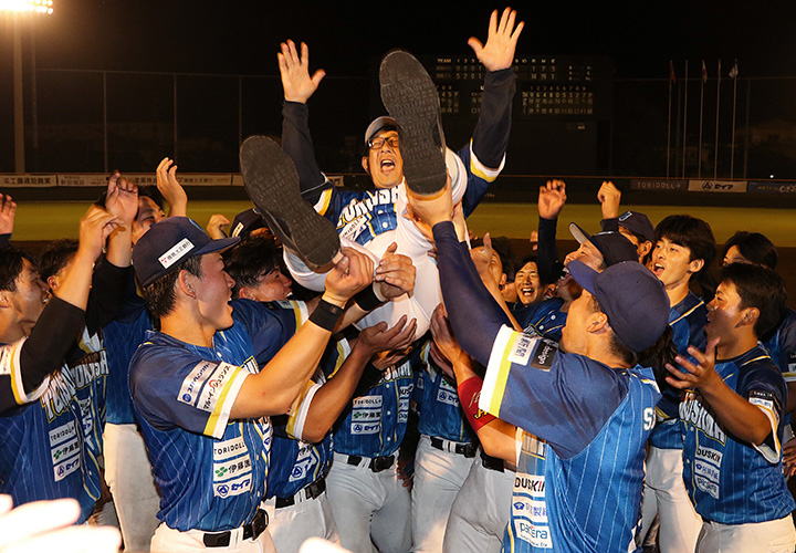 徳島対高知前期10回戦(6月8日、徳島市)の9回表、徳島・斎藤佳紳(天理大中退)が投げた最後のボールは150キロのストレートだった。高知の二番・山口慶十(愛知産大)を空振り三振に取る。その瞬間、2022年後期から6期連続(リーグ新記録を更新)となる徳島の優勝が決まった。