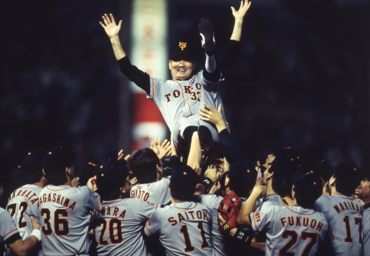 1994年10月8日、勝ったほうが優勝という同率首位決戦で中日を倒した巨人。長嶋監督が胴上げされた/写真=BBM
