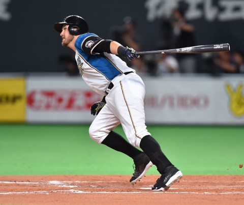8回、逆転打を放ったレアード。オリックスの外野の守備位置がもう少し前だったら……/写真=小山真司
