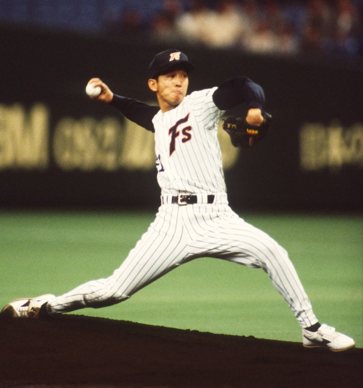 1995年4月22日の西武戦[東京ドーム]で力投しながら大記録も逃し、勝利も得られなかった西崎/写真=BBM