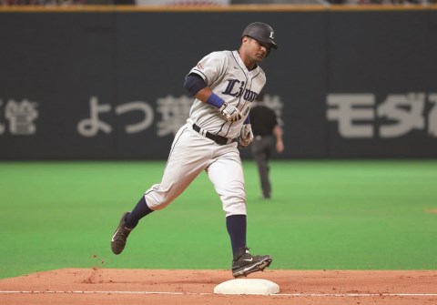 ▲日本での初出場となった5月15日の日本ハム戦(札幌ドーム)では、初打席の初スイングでレフトスタンドへ本塁打。豪快なスイングで強烈なインパクトを与えた