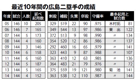 東出輝裕が2年連続で選出されたが、10年から13年まではまた広島の二塁手はベストナインとは無縁であった。