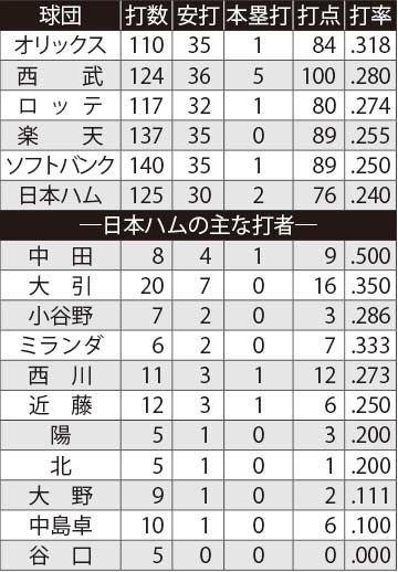 しかし、14年の日本ハムで、満塁で5打数以上打席に立って3割以上の打率を残した打者は中田のほかは.333のミランダと.350の大引だけ。大引は