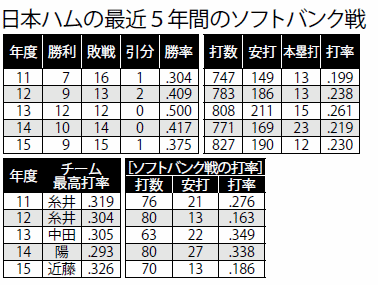 その最大の理由は打線の差である。昨年もソフトバンクは日本ハム戦に打率.274で25本塁打を放っているが、日本ハムは打率.230で本塁打もソフトバンクの半分以下の12本である。11年には打率.199、14年にも.219と、ソフトバンク戦になると日本ハム打線は顕著に沈黙してしまう。
