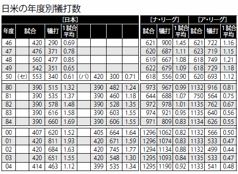 犠打ははるかに日本のほうが多い。DH制のある両リーグを比べるといっそうはっきりする。ア・リーグはパ・リーグの27.8%である。それなのに日本ではパとセ・リーグの犠打数にそこまでの差はない。