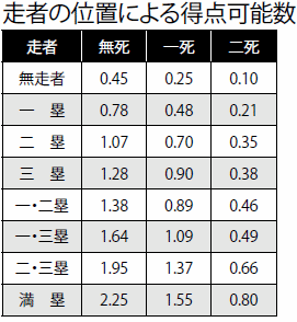 メジャーでは、それを数字の上で解明している。アウトカウントと走者の位置によっての得点の可能性は、幾つかの研究が発表されている。その1つである『Hidden Game of Baseball』から紹介しよう。