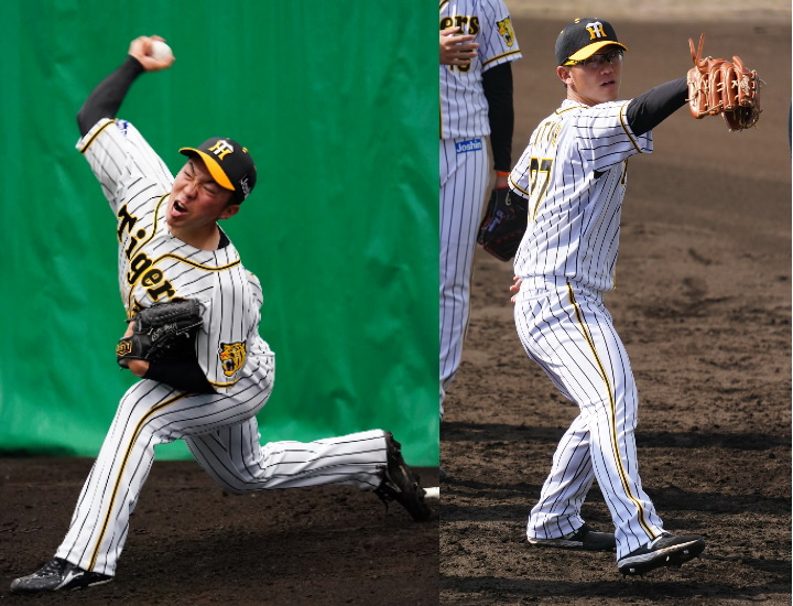 新戦力のドラフト2位の伊藤[右]は高橋のケガでチャンスが巡ってきているがつかめるか!?石井大[左]は小柄で勢いはあるが、全体的なボールの質をもう少し上げてほしいな[写真=毛受亮介]