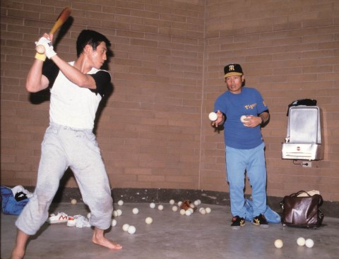 80年のテンピ・キャンプでこちらも獅子から虎となった中西太コーチ[のち監督]=右=にマンツーマンでコーチを受ける