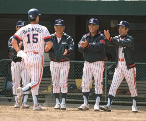 88年、ヤクルト監督時代の関根[右端]。指揮官につられてか(?)安藤コーチも佐藤コーチも楽しそうだ[左へ]。15番はホームランを放ったデシンセイ