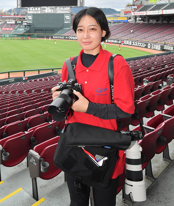 シャッター音が響く。その先には球場観戦に訪れたファンの楽しそうな笑顔。入社3年目を迎えた西小野涼香さんは、オフィシャルカメラマンとして数々の写真をカメラに収めてきた。地元・広島に欠かすことのできない球団、球場、そして、それを支えるファン。一つひとつ、一人ひとりの思い出を形に残している。 母方の祖父が写真を撮るのが好きだったんです。それで、私が子どものころに、母に運動会などを撮影する用にカメラを譲ってくれて。それを私が勝手に触り始めたのが、カメラを始めるきっかけでした。子どもながらにシャッターを押すのが面白くて楽しかったんですよね。