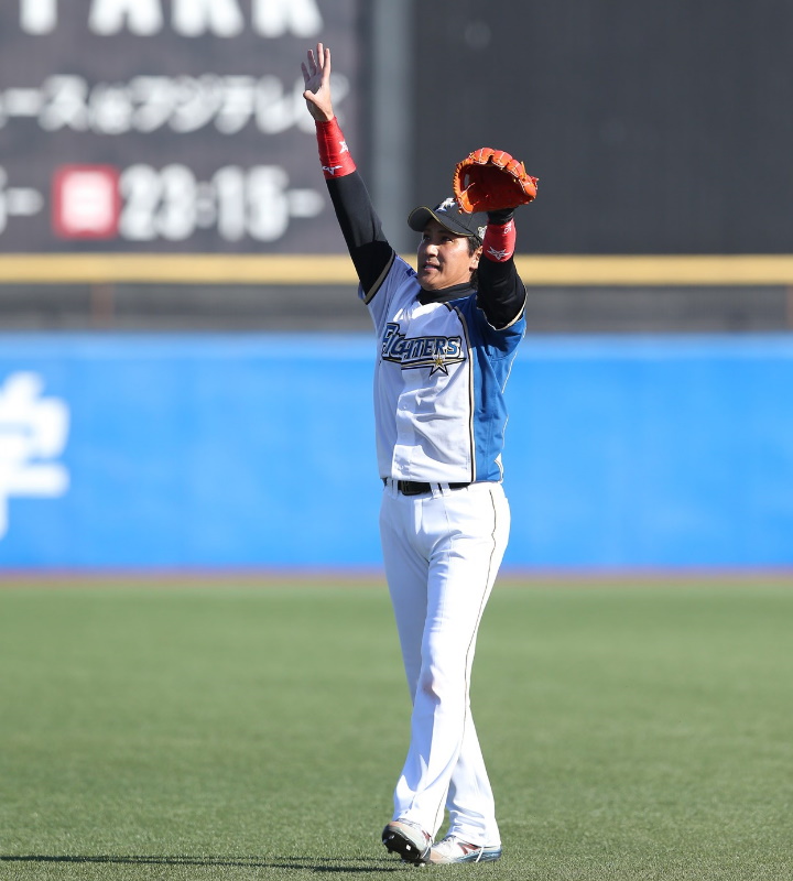 約1年を掛けて体を絞りトライアウトに懸けてきたという新庄。そのパフォーマンスはさすがです。守備はいまだに超一流でした[写真=桜井ひとし]